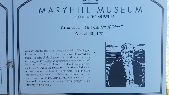 After watching the temps rise towards the low 100s, after visiting Cottonwood Canyon State Park, we wondered what to do. We saw that the Maryhill Museum of Art (and assumed correctly that it was air conditioned) was just over the border in WA so we drove back through the town of Wasco to Biggs Junction where our hotel was. We picked up coffee and a snack, and then drove over the bridge into WA and six miles to the museum. When we had previously toured Historic Route 30 along the Columbia Gorge, we had read about Samuel Hill the builder. He cursed so much that his name became a substitute for cursing - rather than saying "what the hell are you doing?" people would say "what in Sam Hill are you doing?"