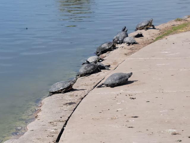 One day, a whole batch of turtles were sunning themselves on the side of the upper pond. I was surprised that Piper and I were able to get so close before that started jumping back into the pond.